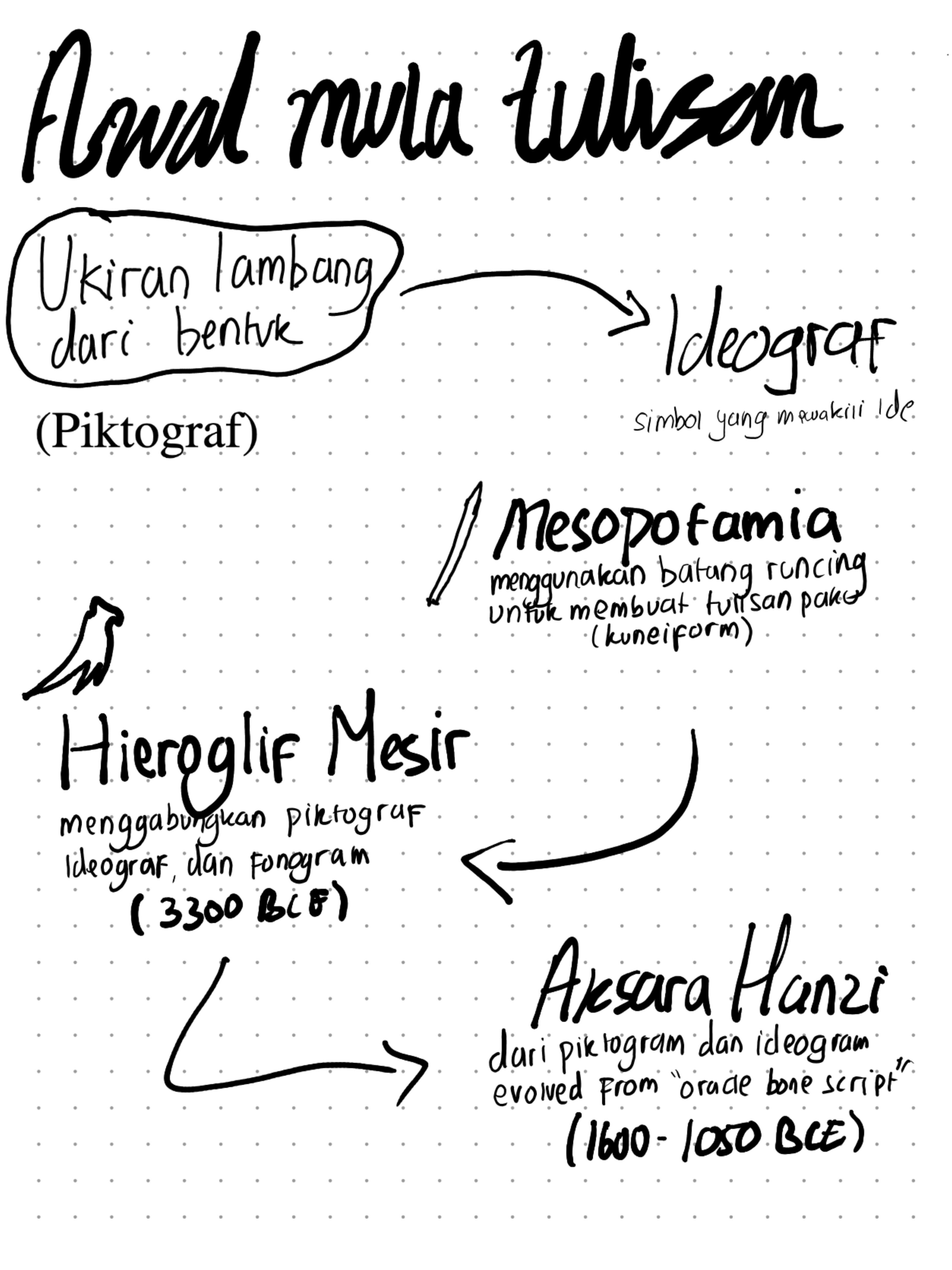 Sebelum tulisan seperti sekarang ada, dulu orang-orang mengekspresikan idenya menggunakan piktograf—menggambarkan sesuatu sesuai dengan bentuk objeknya. Berawal dari Sumeria yang berada di bagian selatan dari Mesopotamia itu piktografi ditemukan. Diukir di atas tanah liat.