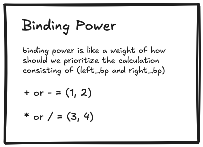 So funktioniert ist. Zunächst rufen wir eine Funktion expr_bp auf. In der Funktion haben wir das erste Token als lhs erhalten. lhs bedeutet “Left Hand Site” (linke Seite). Wir starten die Schleife. Haben wir ein nächste Token überprüfen. Wenn das nächste Token ist ein EOF oder Semikolon, brechen wir die Schleife.
